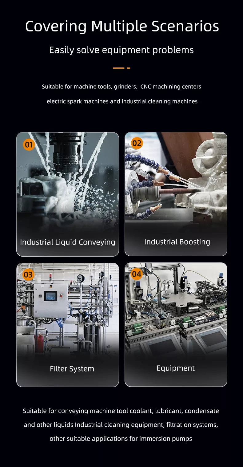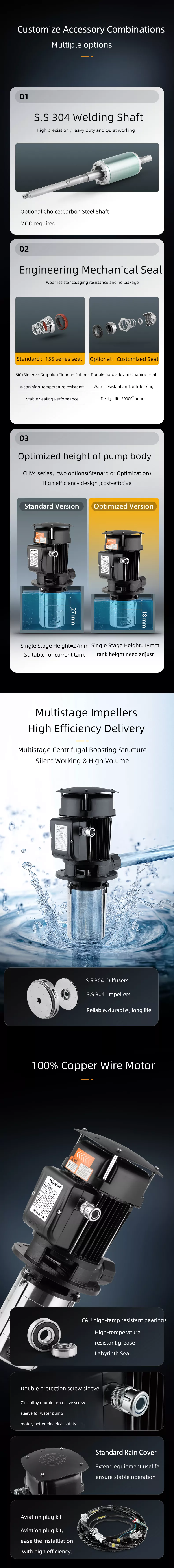 নিম্নে CHV সিরিজের একটি পরিচিতি দেওয়া হল CHV ইমারসিবল মাল্টিস্টেজ সেন্ট্রিফিউগাল পাম্প, যা একটি নিমজ্জিত পাম্প বা মেশিন টোপাম্প নামেও পরিচিত, এটি মেশিন টুল কুল্যান্ট, লুব্রিকেন্ট, কনডেনসেট ওয়াটার ট্রান্সফার, ইন্ডাস্ট্রিয়াল ক্লিনিং ইকুইপমেন্ট, পরিস্রাবণ সিস্টেম এবং নিমজ্জিত পাম্প ব্যবহারের জন্য উপযুক্ত অন্যান্য অ্যাপ্লিকেশানগুলি পৌঁছে দেওয়ার জন্য ব্যবহৃত হয়। এটি মেশিন টুলস, গ্রাইন্ডিং মেশিন, সিএনসি মেশিনিং সেন্টার, ইডিএম মেশিন, ইন্ডাস্ট্রিয়াল ক্লিনিং মেশিন এবং অন্যান্য সরঞ্জামগুলির সাথে একীকরণের জন্য আদর্শ।