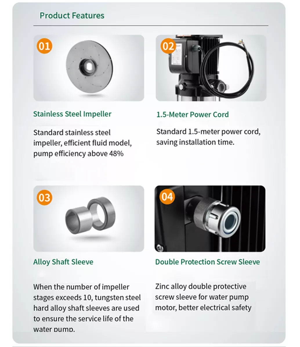 পাম্প হেড বিভিন্ন প্রয়োজনীয়তা মেটাতে impellers সংখ্যা পরিবর্তন করে সামঞ্জস্য করা যেতে পারে। এটি পরিষ্কার জল বা অনুরূপ বৈশিষ্ট্যযুক্ত তরলগুলির জন্য উপযুক্ত, যখন নির্দিষ্ট মডেলগুলি ক্ষয়কারী মিডিয়ার জন্য কাস্টমাইজ করা যেতে পারে।